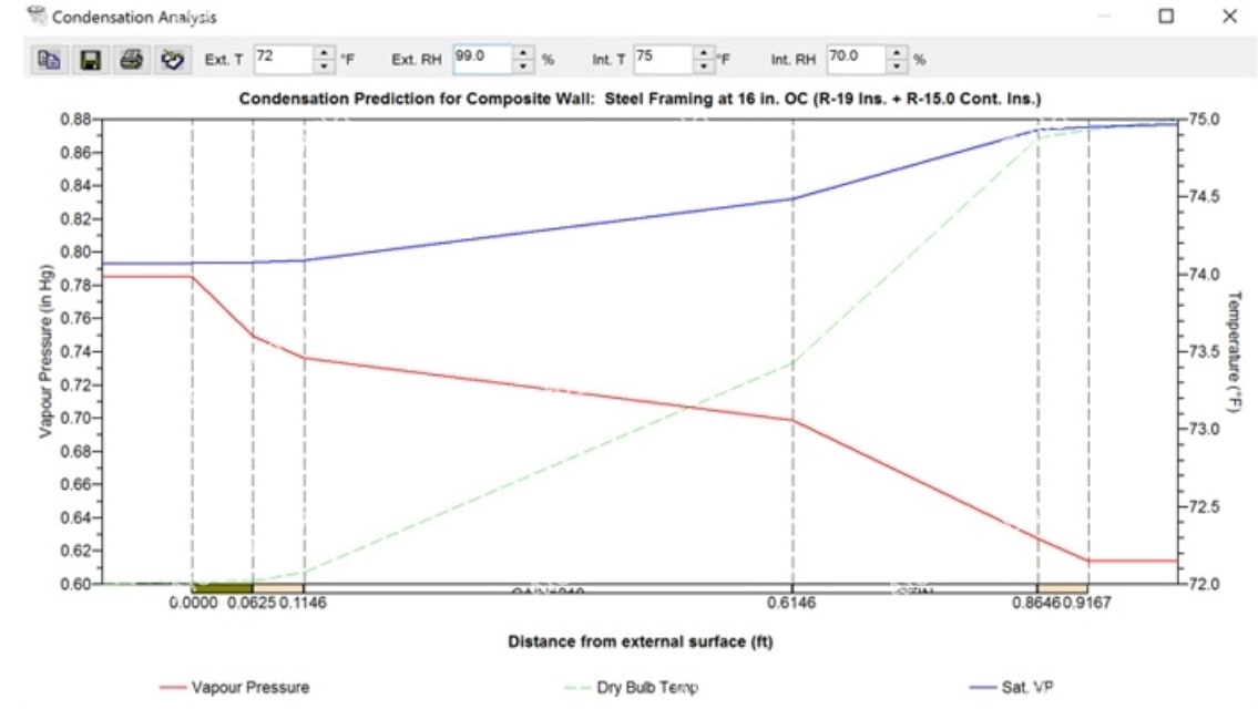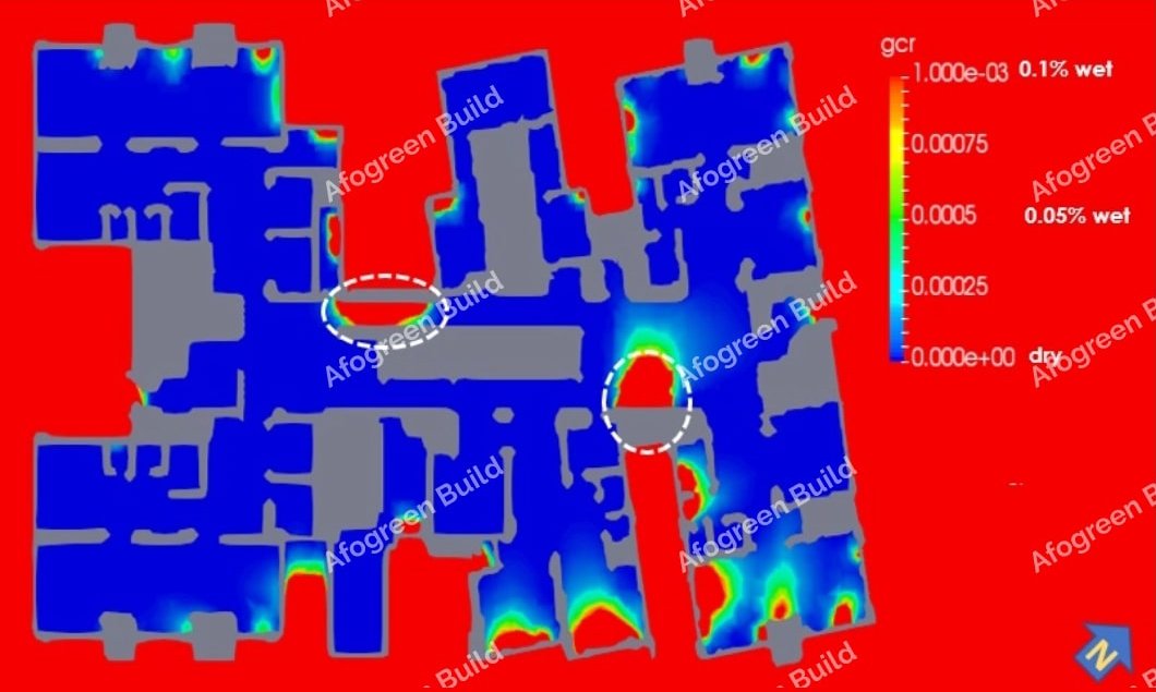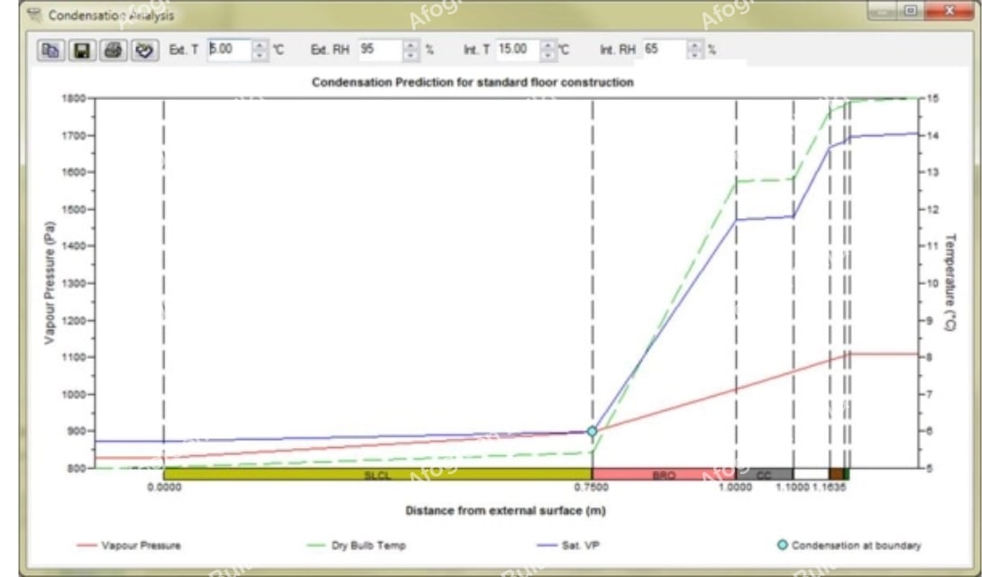 At locations where condensation may occur, such as in basements or at facades near air conditioning diffusers, it is essential to estimate the condensation occurrence based on the selected material properties. The simulation result can determine whether better materials must be considered to prevent condensation.