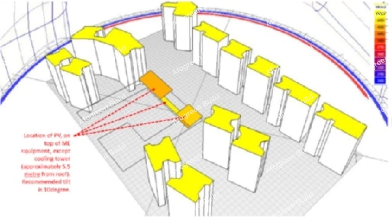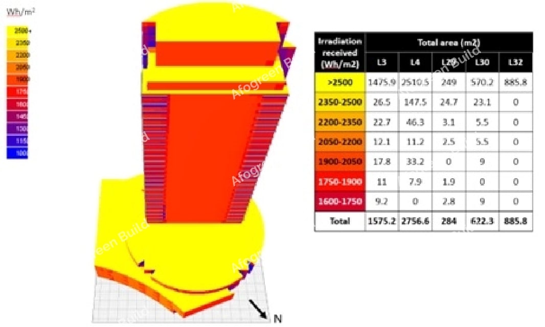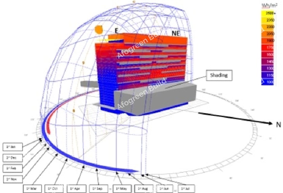 High solar radiation is desired if photovoltaic (solar panel) is considered. Otherwise, low solar radiation is preferred, especially on window areas. The amount of solar radiation on the building façade and roof varies depending on orientation and shading conditions. Sunpath analysis can be used to estimate whether the design will achieve the desired amount of solar radiation.