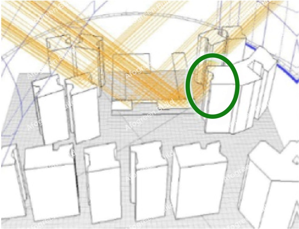 Reflective façade, or roof, or solar panel (photovoltaic) may result in glare to surrounding buildings. This can be prevented by tilting the angle of the material or panel correctly. It is best to simulate rays from the sun on the reflective panels prior to installation, so that glare can be avoided. This study is important especially for projects located in densely populated areas.